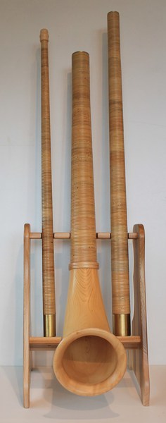 In dem Alphornständer in massiver Eiche kann ein dreiteilges Alphorn sowie 2 Mundstücke untergebracht werden. Ohne Alphorn.
